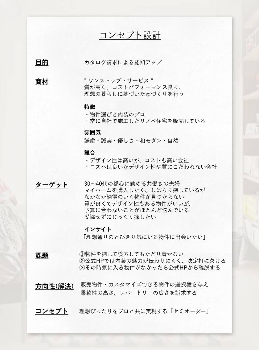 競合が多い中、他社と差別化するにはどうすべきか、カタログ担当者と共にコンセプト設計を行いました。