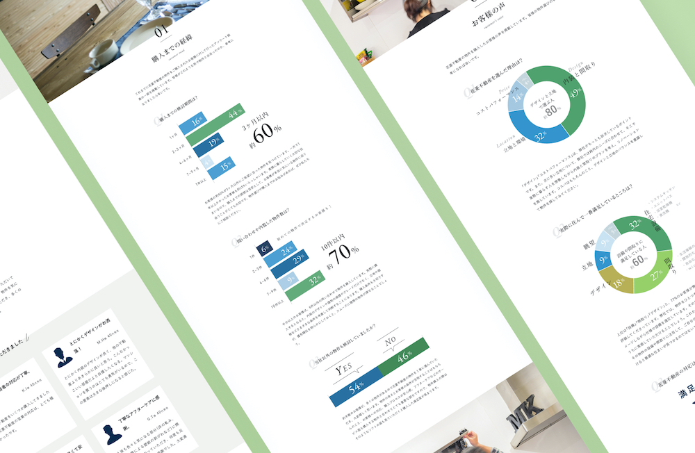 グラフが多いページとなりますが、グリーン(コーポレートカラー)+ブルーの2色でデザインすることで