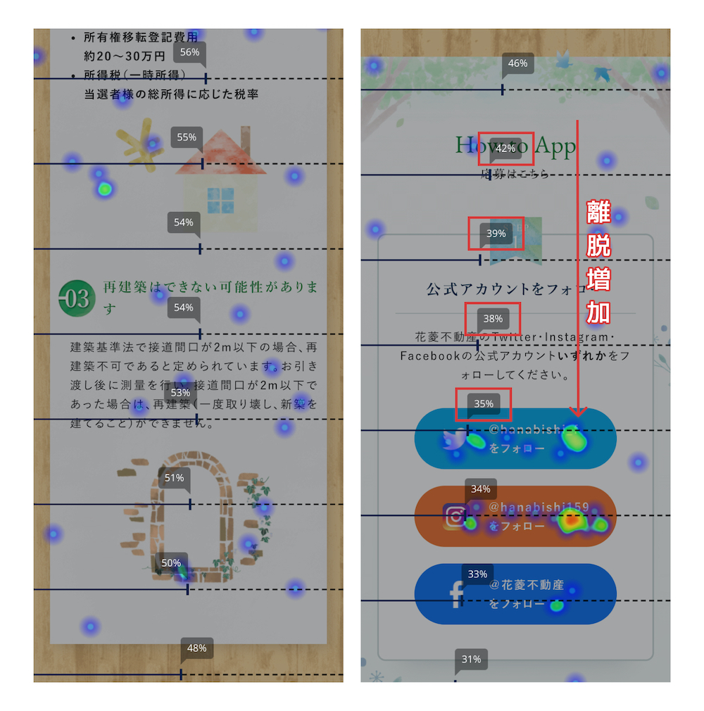 離脱度合いは基本的に良好なのですが、応募コンテンツに入ってから若干増加しておりました。