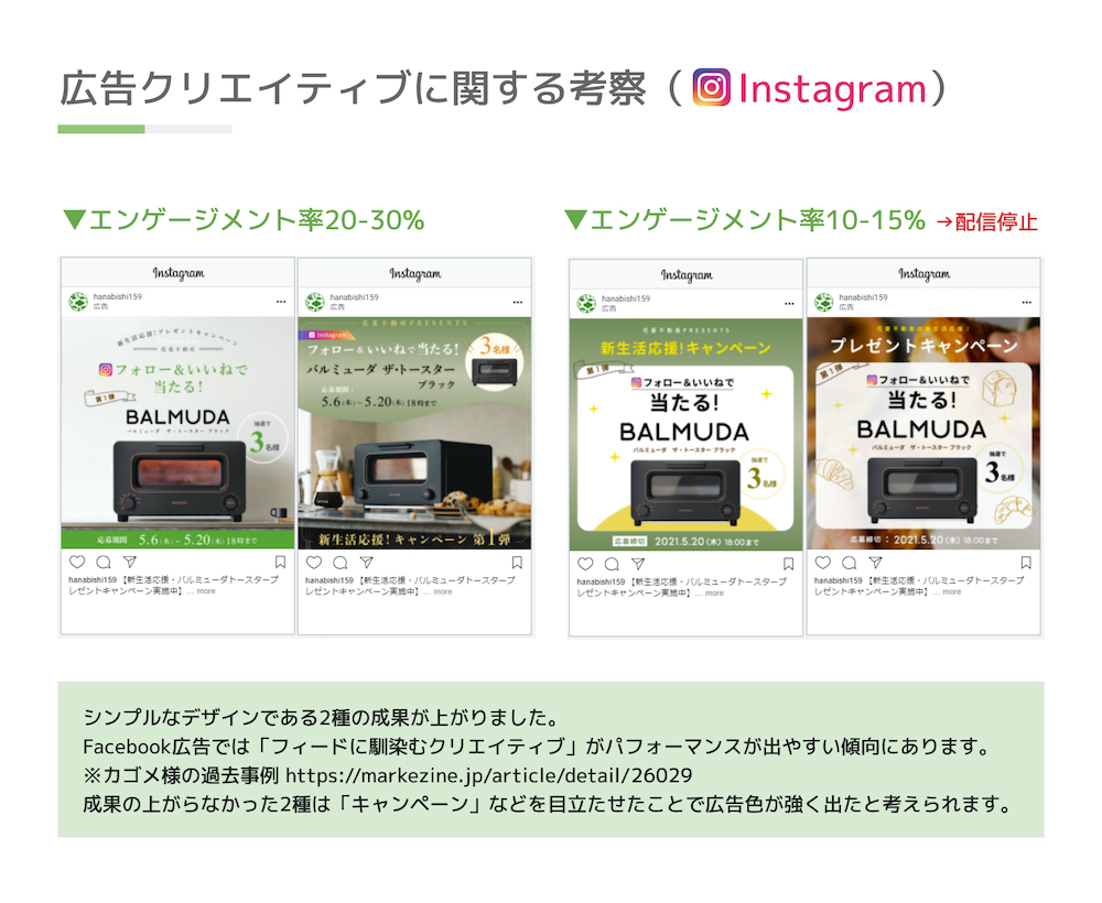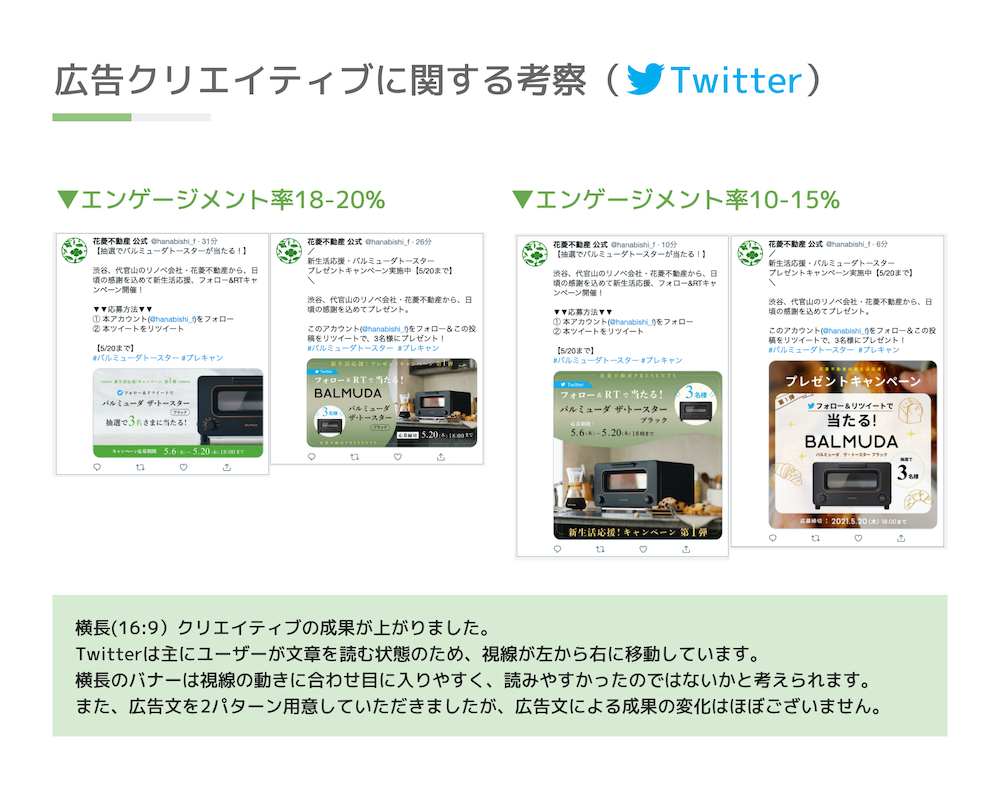 平均エンゲージメント率は高水準であったため、訴求はそのままに別ターゲットへ配信することで改善に繋がると考えられます。