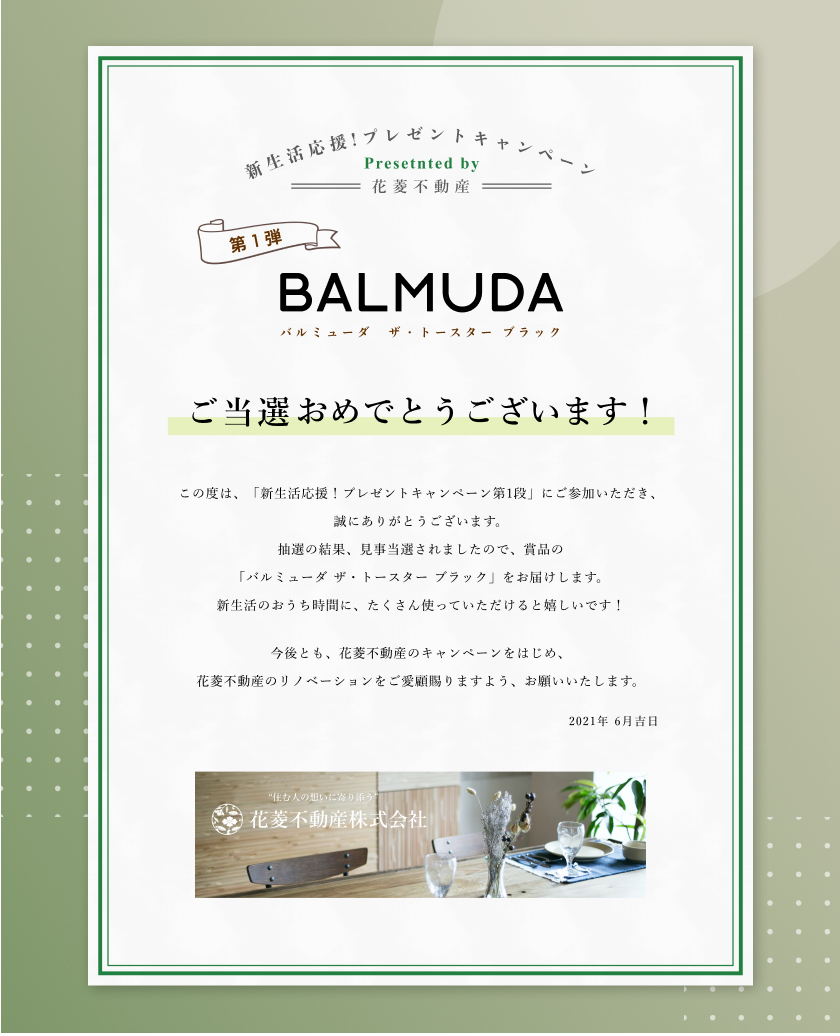 不動産会社が主催する「バルミューダプレゼントキャンペーン」。